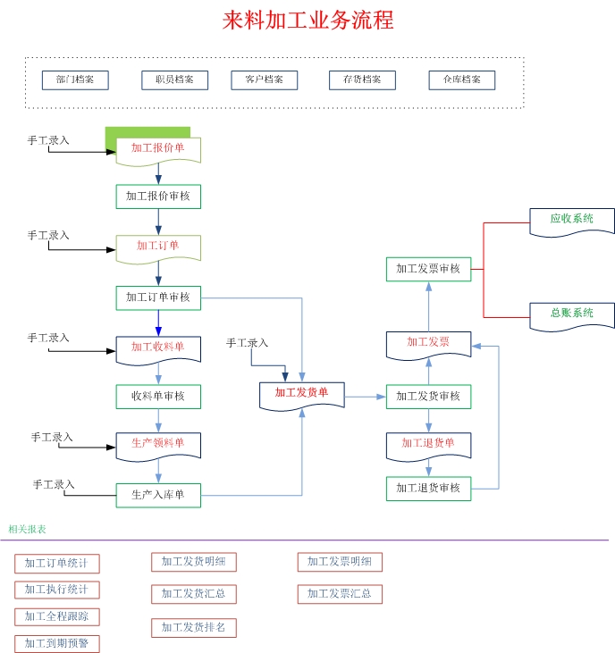 来料加工是一种代工不代料的产品加工加工方式。是指由于委外企业生产能力不足,或有特殊工艺要求,或自制成本高于委外成本,或因其它原因,需要由委外企业提供加工材料,由加工企业领料后负责完成委外件的生产,之后结算相应加工费用的一种加工运作模式。来料加工管理系统以加工生产任务单为核心,支持严格按照来料加工生产任务单进行收发料的业务处理,支持严格按照来料交工生产任务单开具来料加工费发票的业务处理。来料加工管理系统帮助用户对来料加工业务的全部流程进行管理,提供来料生产任务单下达、来料加工材料入库、来料加工出库、加工材料存货核算、加工费用结算等完整来料加工业务流程的管理来料加工管理系统,通过先获取加工单,由加工单位根据委托加工单位到相应的公司领料,并及时送入半成品仓库办理入库手续。加工时,工人从半成品仓库取料,经过若干工序后,在车间检验,及格后进行包装,送入成品仓库.由加工单位加工完成的产品填一张送货出库单。