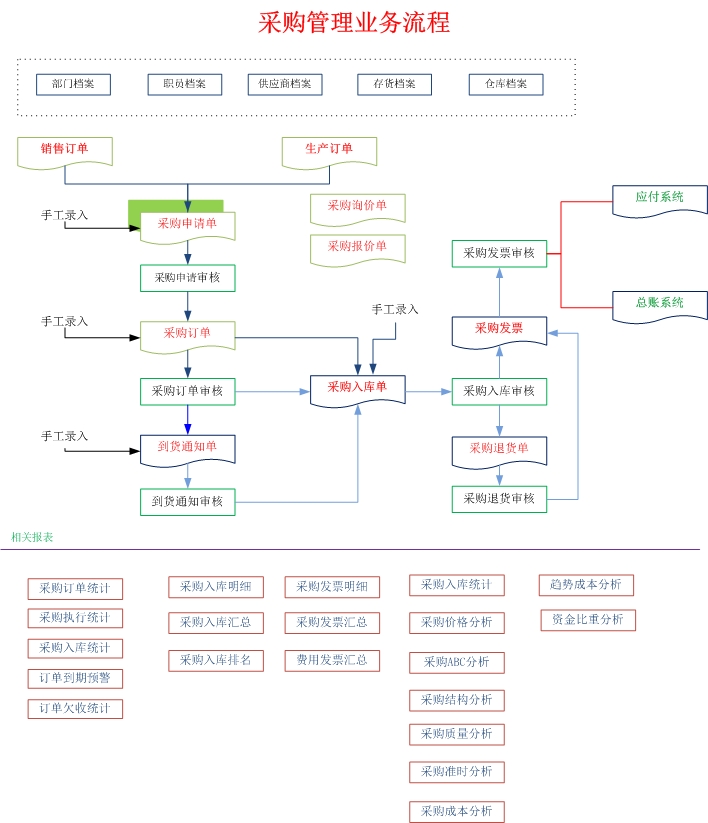 采购管理系统通过采购申请、采购订单、采购检验、采购收料、采购发票、采购退货等各种业务处理,加强各业务间流程与管理信息集成管理,对采购全程的有效跟踪和控制,实现完善的供应商供货信息管理。通过和库存系统、应付系统、存货核算系统的共同使用实现企业采购业务全部的物流及财务管理。通过报表查询,及时了解企业各项采购业务的执行明细、汇总情况;通过分析报表的查询,及时了解企业各项采购分配情况,各项供应商供货情况,为企业的采购决策提供依据。企业由于供应商多,物料品种规格多,采购量和金额大,所以采购作业控制是企业物料管理的重点。采购管理系统实现采购申请、采购订单管理、来料检验、材料入库、外购结算的整体流程应用,结合供应商供货信息、供应商价格管理、供应商配额管理以及供应商评估等一系列功能,帮助企业建立统一的供应商管理平台,从质量、价格、交期、交货准时率、服务水平等方面对供应商进行全面管理。从而通过有价格优势的采购,确保企业的利润,提供实现物流和资金流的全过程双向控制和跟踪,实现完善的企业物资供应信息管理。建立供应商的信息库,做到供应商信息透明;建立采购价格的信息库,做到不同供应商不同价格可以进行比较;建立采购合同的信息库,做到采购合同可以进行统计分析,监督控制;提高资金的利用率;,通过信息共享,了解实时库存信息;采购时需要查询需要采购的相关原料的情况;通过建立供应商的档案,以及相应的供应价格,供应商的交货历史记录,进行相应的供应商的评估;对不同的物料有不同的采购周期,希望能够通过报警,进行采购订单的跟催;设定物料的采购周期和报警机制,提前通知采购员进行相应的跟催工作;